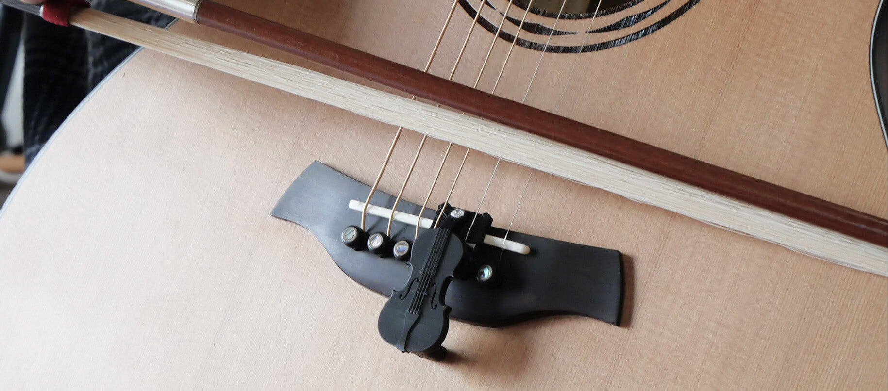 Guit-Arco(ギット・アルコ) をアコースティックギターに取り付ければ、バイオリンやチェロのようなボウイング演奏が可能になります。