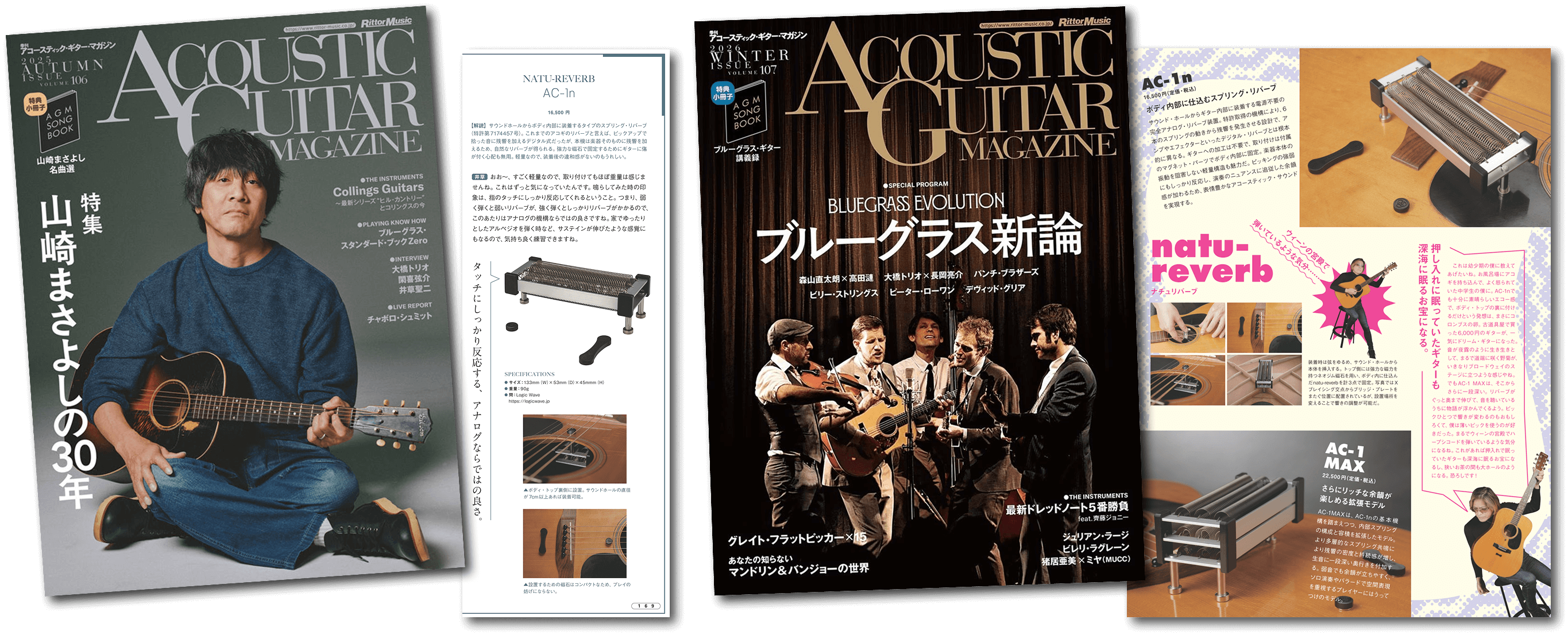 他の製品がピックアップで拾った音に残響を加えるデジタルのリバーブなのに対し、natu-reverbは楽器そのものに本物の残響を加えるため、自然なリバーブが得られます。